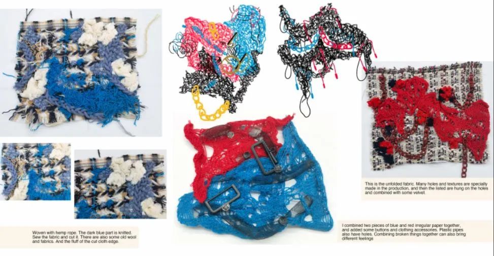 但是在服裝設(shè)計的預(yù)科學(xué)習(xí)中,我發(fā)現(xiàn)自己很喜歡面料改造這一個小part。我的動手能力比較強(qiáng),本來就喜歡做一些奇奇怪怪的手工和實(shí)驗(yàn),所以覺得做面改就像玩一樣,愿意去嘗試很多方式,實(shí)驗(yàn)很多次也不會覺得煩,我覺得面料設(shè)計非常非常適合我,也可能這就是熱愛吧,啊哈哈哈。