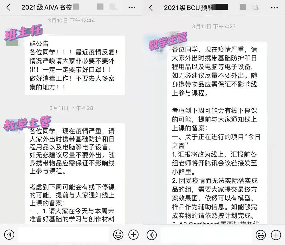 3月14起,AIVA所有課程都由線下轉為線上。半個多月以來,預科課程按進度進行,教學部及時調整授課形式,保障課程無縫銜接。 ▲ 3月14日起,所有預科課程轉為線上,視頻、語音、群聊齊上陣! ▲ 4月8日,AIVA國際藝術名校預科進行了第二學期期末Assessment,連線英國外考官姜節泓教授參與考核。 ▲ 特殊時期的課堂,有時會被捅????or捅????打斷。 ▲ 在家上網課,如何集中注意力? 由于無法使用工作室,以及因物流導致材料的局限,同學們很多項目作品只能通過效果圖或是模型來呈現。不過,這也激發出了同學們在有限的條件下打開腦洞,挑戰用特別的方式呈現自己想法與創作的創意潛能。 ▲ 手繪效果圖、電腦效果圖、材料與模型實驗......同學們用各種方法展示自己的創意想法。 ▲ 每次網課的最后,都會變成大型云吸寵現場。 除了學習,封控給很多同學的生活也帶來了一定的影響。有一部分預科學生住在學生宿舍或獨住租房,封控期間,班主任老師時刻關注著大家的情況,了解同學們遇到的急難問題。無論是物資、藥品還是突發情況,盡最大可能幫助大家解決,安撫同學們的情緒,一起度過這段隔離時期。 ? 宿舍食堂每天會為同學們將盒飯打包送至宿舍,葷素搭配。還有營養水果▼ ? 為了讓學生在封控時有足夠的常用藥品儲備,班主任老師在3月末外出幫隔離在宿舍的學生配藥。 ? 得知有學生所住大樓一直沒有供應物資,院長及老師們緊急聯系騎手送去食品和生活用品,并與區物資保障部門溝通反應情況。 有學生家中或樓里遇到疫情,教學及班主任老師及時安慰學生情緒,跟進實時情況,盡最大可能提供幫助,鼓勵學生調整心態勇敢面對。 在這段特殊時期里 有許多前所未有的問題與困難 但AIVA始終與每位同學在一起 我們共同面對、守望相助 ?? 祝愿所有人都能平安、健康 在堅持不斷的學習、創作、思考中 保持良好的身心狀態 也期待線下重聚于AIVA的那一天