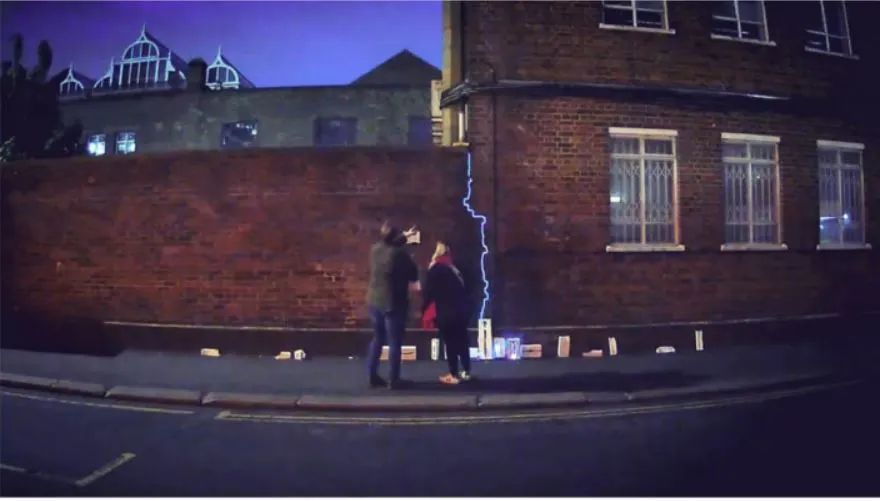 這個藝術家也是去年剛畢業的學生,他講述了疫情封鎖期間,大家在陽臺或窗前互相鼓掌鼓勵的故事。他認為漫長而孤獨的封鎖封閉狀態,給掌聲帶來了前所未有的意義,所以他想記錄下這個時刻,用掌聲取代語言,向人們傳達積極的信號。藝術家用灰泥和黏土制造一個廢墟,結合聲光的交互裝置,使得行人在黑暗中拍手以觸發裝置,用亮起的燈帶修補墻上的裂縫。