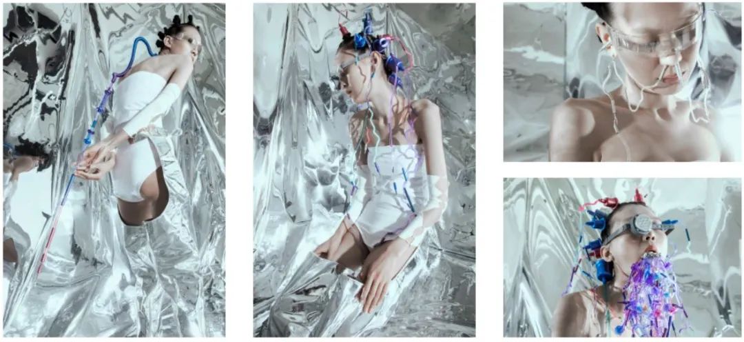 身體在首飾中是不可或缺的,有時是幫助藝術家進行表達。這一系列作品名為“404”,討論高科技的未來一定是光明的嗎?藝術家呈現了一個對人類未來的超現實主義描繪,人類被藝術家轉化為一個音樂播放器,作為機器去生活。當佩戴上這些首飾,才能獲得直觀的感受。在這個作品中,作為模特的人,包括窺探者都是很重要的部分。