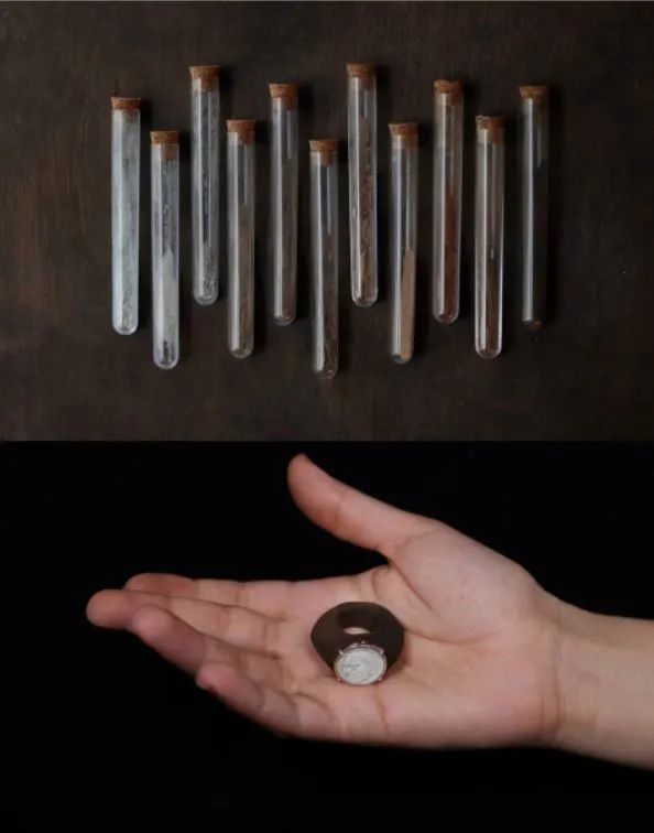 這是RCA去年畢業的學生Mairi Millar的作品。她收集了泰晤士河前岸被沖刷上來的骨頭,并將它們火化分解成細粉,把不同顏色的骨灰粉末分裝進小瓶,重新組裝雕刻制模。藝術家用骨灰做戒指,探討生和死以及靈魂的流動性。不僅是外觀造型需要多元化,多元的材料更能激發人們內在的感受與思考。