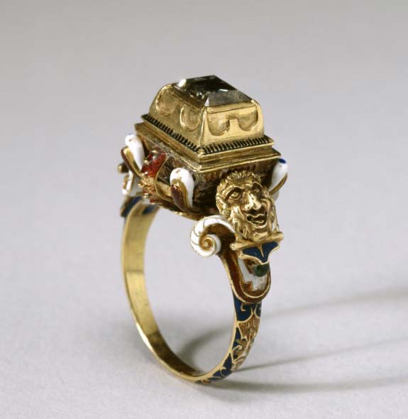在大部分首飾的造型上,一開始的設(shè)計款式是順應(yīng)中世紀(jì),圣經(jīng)宗教故事依然被作為創(chuàng)作的主題,但是隨著人文主義的發(fā)展,更具有個性化的設(shè)計或者與當(dāng)時現(xiàn)實生活的日常物品成為了創(chuàng)作的主流;另外,制作者們也廣范圍從古希臘神話中提取創(chuàng)作主題。這也使得這一時期的作品的造型有無限的可能。