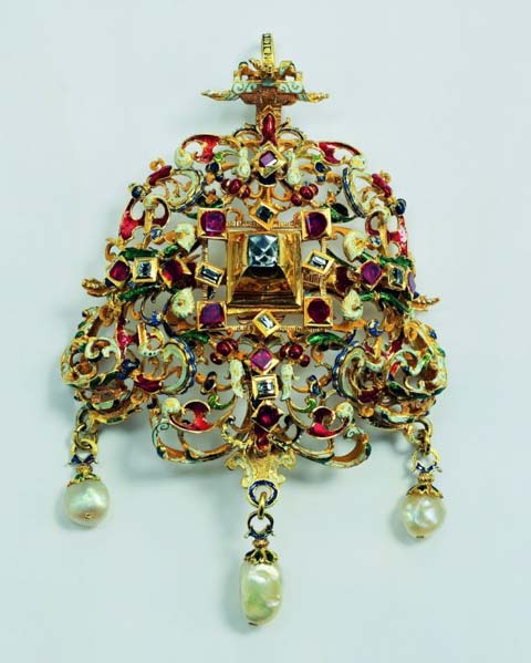 這件造型結(jié)構(gòu)非常復(fù)雜的吊墜,以那一時期常見的卷曲的植物枝干效果為造型,使用彩色寶石與彩色琺瑯來達(dá)到創(chuàng)作上的和諧。該吊墜的制作時期雖然為藝術(shù)史上的風(fēng)格主義時期,但是首飾的制作風(fēng)格變化遠(yuǎn)不如繪畫或者雕塑來的迅捷,因此在這件吊墜上我們依然可以感受到文藝復(fù)興時期對于和諧之美的追求。從穩(wěn)定且對稱的基礎(chǔ)造型,寶石與琺瑯交錯創(chuàng)造的濃烈色彩對比,中性圍繞式的布局構(gòu)建,無不展示了當(dāng)時工匠精湛能力。部分也歸功于當(dāng)時已經(jīng)形成了具有學(xué)校制度與體系的專業(yè)的手工藝培訓(xùn)工作室。