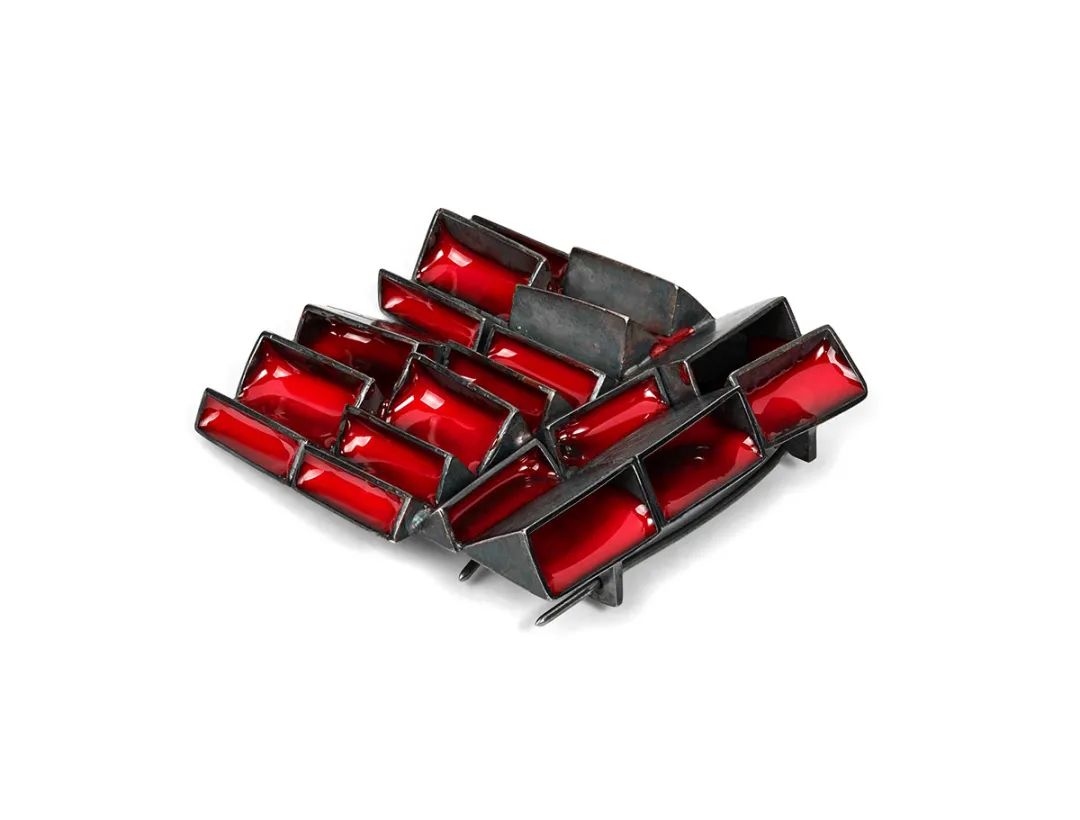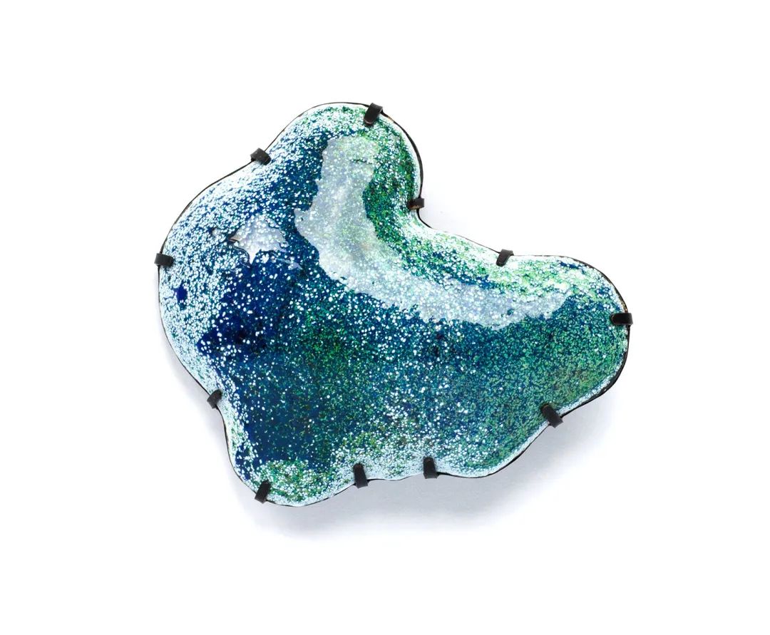 與傳統珠寶作品中寶石與構成結構支撐的貴金屬相輔相成不同,這些作品中,寶石以薄片的形式被分層重疊,形成對比鮮明的不透明部分,然后使用彩色樹脂將它們連接在一起,制作成為整個胸針。