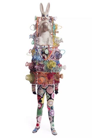 Mixed media including vintage bunny, safety pin craft baskets, hot pads, fabric, metal, and mannequin
