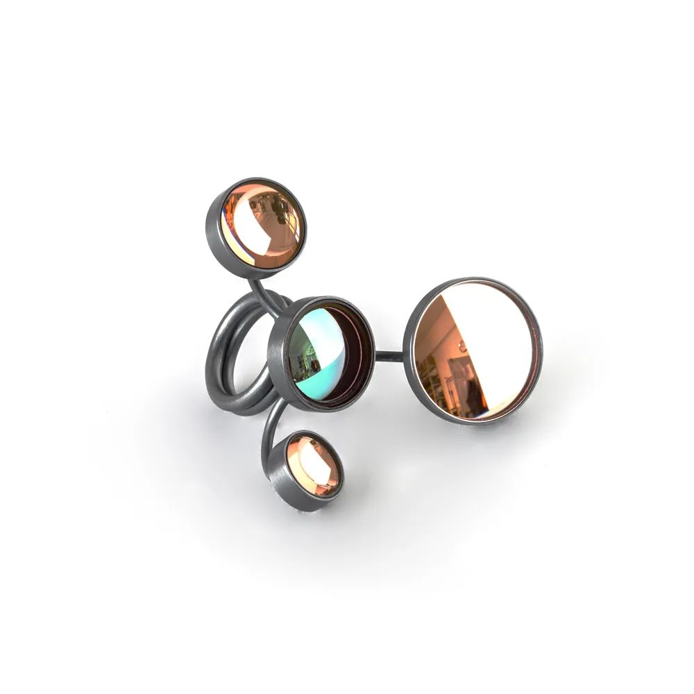 首飾和物品——揭示自然構(gòu)造方面的作品——從礦物、植物和景觀形態(tài)中提取的圖案。Regine Schwarzer的作品主要由自己手工切割的貴金屬和寶石制成。