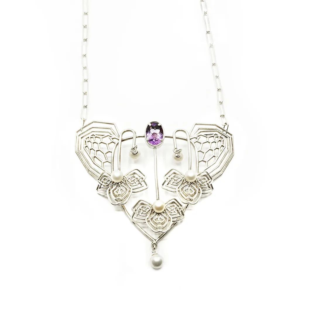 無論是參考風景還是建筑或兩者兼而有之,金屬匠 Eleanor Moty 創(chuàng)造出獨特的首飾,詩意地圍繞著佩戴者和觀眾。Moty 在 1960 年代和 1970 年代憑借在裝飾中使用了尖端的制造技術(shù),例如電鍍和光刻,首次獲得認可。在過去幾十年中,她將重點轉(zhuǎn)向在作品中加入寶石,她創(chuàng)作的大型胸針體現(xiàn)了與石英石“線性圖像”的對話。