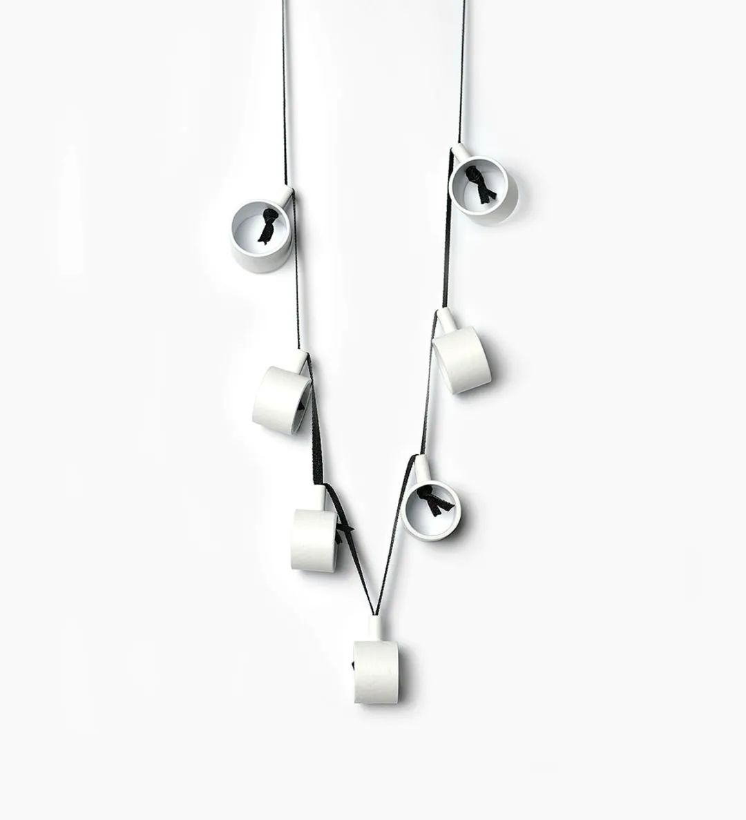 荷蘭首飾藝術(shù)家 Annelies Planteydt 的作品通過線條、填充、形狀來反映日常生活的組織或結(jié)構(gòu)。這些作品可以在不同的階段進行觀看——首先是一幅幾何形狀的繪畫。第二階段發(fā)生在拿起它時,從表面觀察并以半流體形式塌陷時,繪畫的順序被打亂了,但運動中有一個美麗的新形態(tài)。第三,被佩戴時,佩戴者可以重新定位項鏈和結(jié)構(gòu) - 繪圖階段引用的細節(jié)是模糊的,但永遠不會消失在視線或腦海中。
