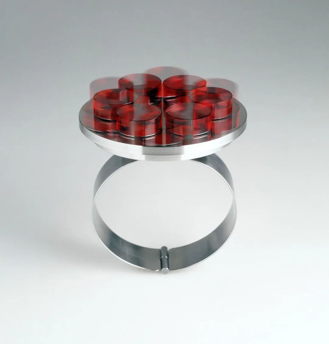 Feulner 專注于圓形來創(chuàng)作項鏈和胸針,這些作品在本次展覽中相得益彰。在近期的探索中,她手鋸了金、銀、青銅和粉末涂層鋼,以創(chuàng)造出不同表面紋理的形狀及其無數(shù)次迭代。據(jù)這位藝術(shù)家說,“循環(huán)是對一種形式及其運動的無聲關(guān)注——圓圈……尋找它的重復(fù)和旋轉(zhuǎn)以創(chuàng)造節(jié)奏和平衡,并找到一條沒有明顯開始和結(jié)束的線條。”