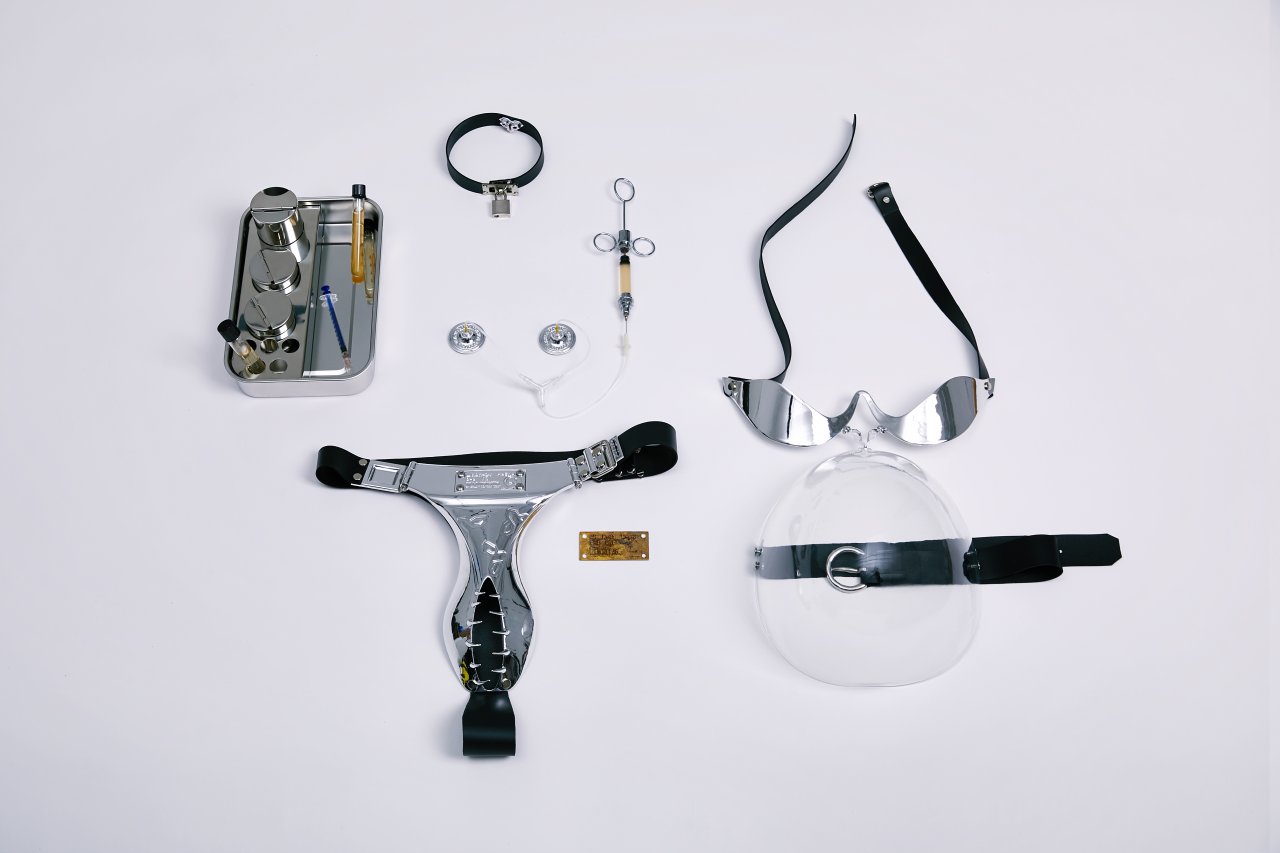 《庇佑卵子》描述了在科技高度發(fā)達(dá)、生育率極低的社會中女性的處境。該系列創(chuàng)作來反映女性不可避免地受到生殖剝削的社會現(xiàn)象。該系列有5件作品,包括:貞操帶、卵子提取器、性激素檢測項圈、裝飾性孕肚與體外胚胎培養(yǎng)裝置。