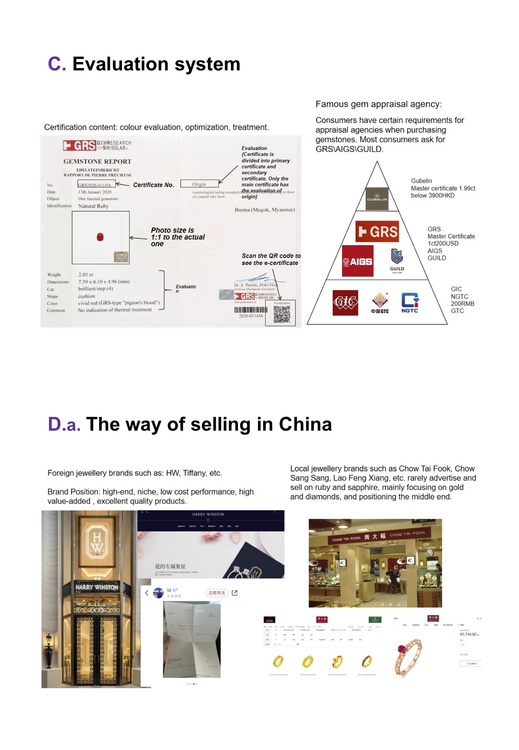 In the first project, I compared how Chinese jewelry sellers of different scales operate their businesses, including their product types, price ranges, and customer demographics. In the second project, I surveyed gemstone customers with a budget of approximately CNY 300,000. I collected information on the background history and trends of the gemstone market in China from the modern age, as well as the current status of gemstone trading both online and in physical stores, through interviews with buyers and sellers.