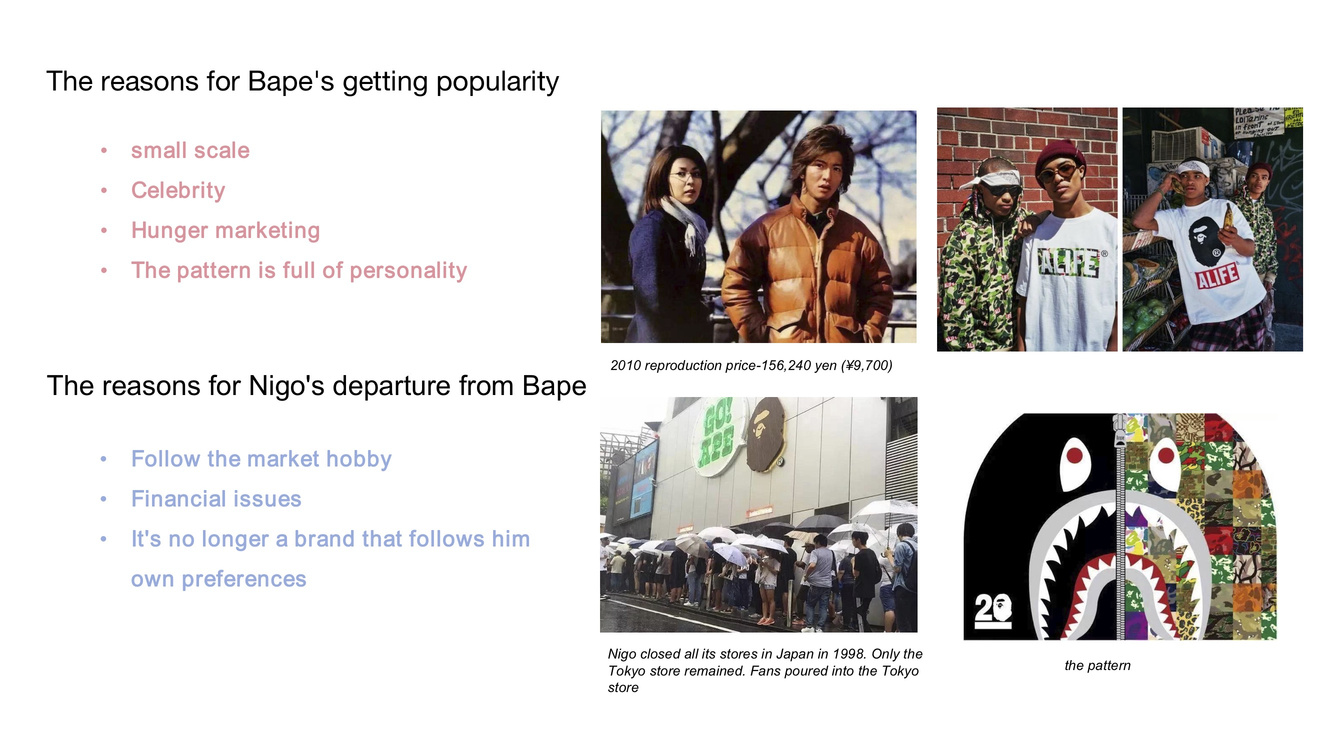 I researched the basic information, strategies, and consumer demographics of both Bape and Human Made, as well as the personal background of their founders. I compared the development history and operational models of the two brands. During this process, I interviewed a designer who is also a brand owner and faced similar questions. From this series of research, I found that many designers mistakenly equate design success with business success, but I believe different roles in brand operation should be distinguished.