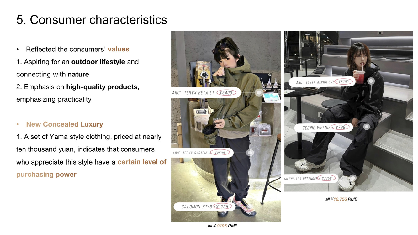 The success of Human Made also drew my attention to the rise of outdoor culture and trends symbolized by brands like The North Face. Therefore, I continued my research into the "mountain style" fashion trend. This style is not only reflected in clothing design but also through the brand's visual symbols, colors, and advertising. The post-pandemic era has seen a desire for freedom and nature, providing further opportunities for the development of this culture and similar brands. The high pricing of mountain-style fashion products reflects the purchasing power and habits of its audience. Based on my research, I have also made some recommendations for the development of such brands: for example, expanding design styles to attract more consumer groups; designing more outdoor safety features for female consumers; and researching or using environmentally friendly fabrics to deepen the cultural significance behind the brand.
