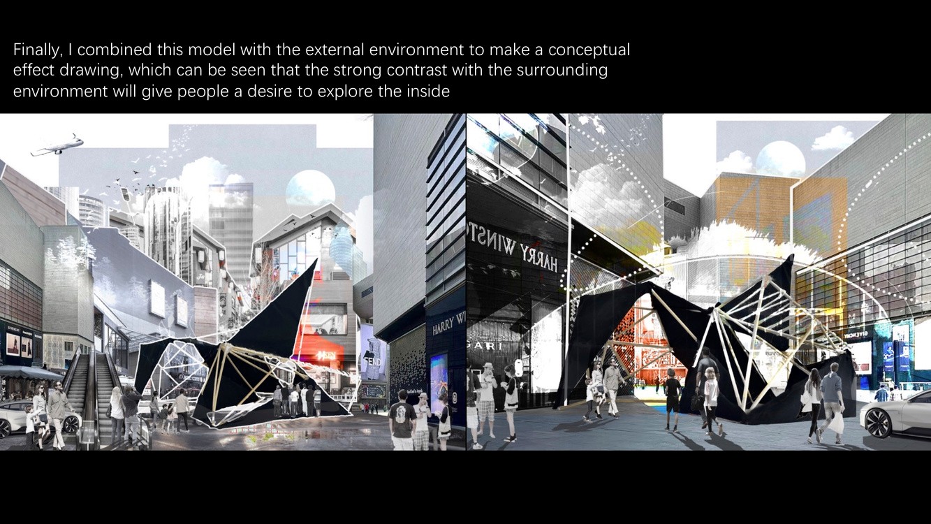 預(yù)科期間的第一個(gè)項(xiàng)目《soft space》的設(shè)計(jì)靈感來(lái)自于鹽田千春作品中對(duì)于的網(wǎng)和線使用。作為初學(xué)者我通過(guò)手部動(dòng)作和絲網(wǎng)的翻折拉伸建立了對(duì)空間和建筑骨架的理解。通過(guò)模型構(gòu)想了一個(gè)綜合商業(yè)中心中庭區(qū)域的藝術(shù)的裝置我希望他可以兼具實(shí)用性和觀賞性,因此我將他的一部分設(shè)計(jì)成:可一些不規(guī)則形狀的長(zhǎng)凳,而后方空間設(shè)計(jì)為行走通道,體現(xiàn)了我在模型制作期間對(duì)包裹這一視覺(jué)語(yǔ)言的運(yùn)
