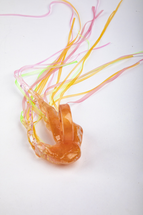 The inspiration for the collection "A Glowing Moment" captures the most memorable moment of my high school art training period. At the end of everyday training, I would clean my brushes and palette. The colorful pigments would blend together with the water, constantly changing hues and shapes. This scenery always healed my fatigue from the entire day. The pieces combined dyed PVC film, colored resin, and UV resin. During the solidification process of the material, I continuously adjust the shape to recreate the free form of water and the effect of colors blending and flowing. Through jewellery, I immortalize the beauty of this fleeting glance.
