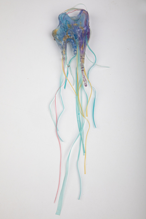 作品《炫彩時光》的靈感來源于捕捉了我高中美術(shù)集訓(xùn)時,一天中最難忘的時刻。在結(jié)束一整天的繪畫訓(xùn)練后都會清洗筆刷和調(diào)色盤,顏料隨著水流融合在一起并不斷變化色彩和形態(tài),這個瞬間治愈了我一整天的疲憊。作品使用了經(jīng)過染色的pvc薄膜、調(diào)色的樹脂和uv膠,在材料凝固的過程中我嘗試不斷地調(diào)整形狀以重現(xiàn)水自由的形態(tài)和顏色融合流動的效果。通過首飾,我將這一瞬間的美麗化為永恒。