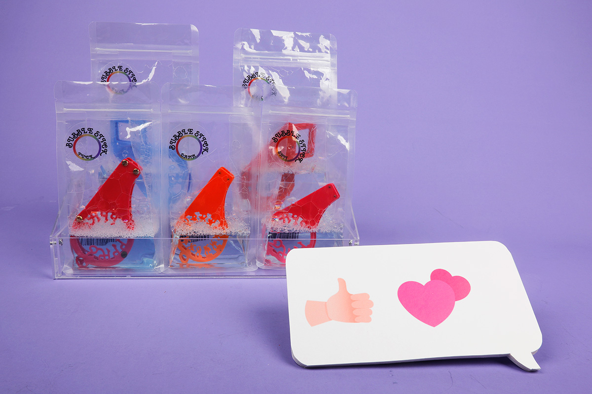 徐貝怡的首飾主要探究生活中一些細(xì)微之處,利用觀察和感悟去重塑人們對一件事物的固有理解,帶領(lǐng)觀者重新審視和思考被人云亦云的觀念。在作品《離異家庭標(biāo)簽》和《情緒臟話》中都有所體現(xiàn)。探討的觀點雖并非和主流價值背道而馳,卻往往是被大眾所忽略的層面。它們同樣具有被討論的價值;以《情緒臟話》為例,為了體現(xiàn)臟話的積極影響,作品采用臟話紋樣的泡泡棒,以及吹泡泡的形式,引發(fā)觀者的愉悅感,從而切實的體會到作品主旨。