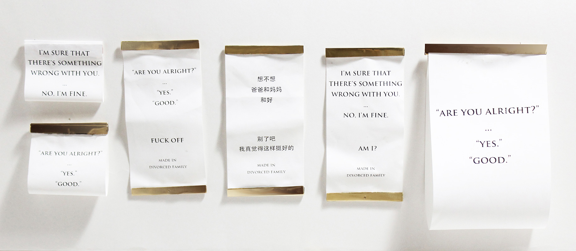 It has reflected on work <The label of divorced family> and <Cathartic swearing>. The key content expressed not to overthrow mainstream values, they are just hinting to remind the aspects that you ignored. Those trifling matters which people don’t see the value in are worth discussing as well. For example, in order to display the positive of bad language, the work has adopted the bubble sticks with swearwords and the form of blowing, which can bring a sense of pleasure and give straight feeling to audiences in <Cathartic swearing>.