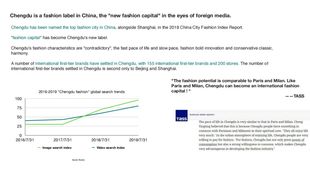 我的第三個項目靈感來源于《2018中國城市時尚指數報告》中成都被評為與上海齊名的“中國時尚一線城市”的報告內容。所以我試圖在我的項目中探討研究成都成為中國潮流標簽的原因。從成都的基本地域情況,人民的作息習性、消費觀價值觀,以及成都潮牌文化的發展去分析研究成因。為此,我進入上海時裝周實習了兩周的時間,研究成都服裝零售市場的市場推動因素是什么?成都電子商貿業務興旺的原因?成都市場如何劃分的更細致了以及成都多品牌營運的方式?最后,我從發展和趨勢兩方面總結了成都潮流市場的未來走向。