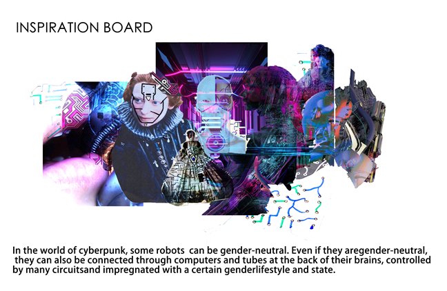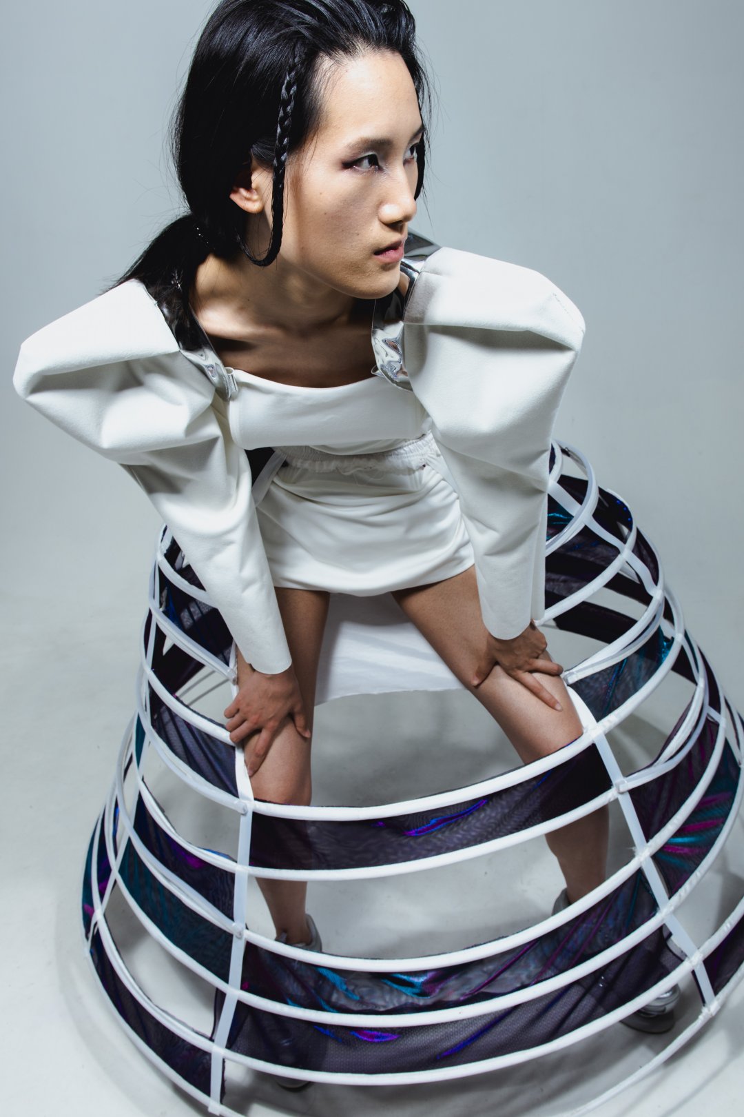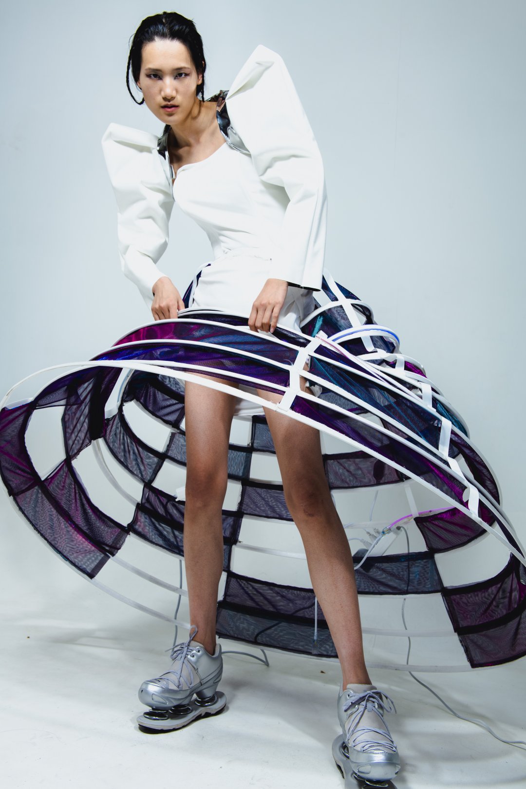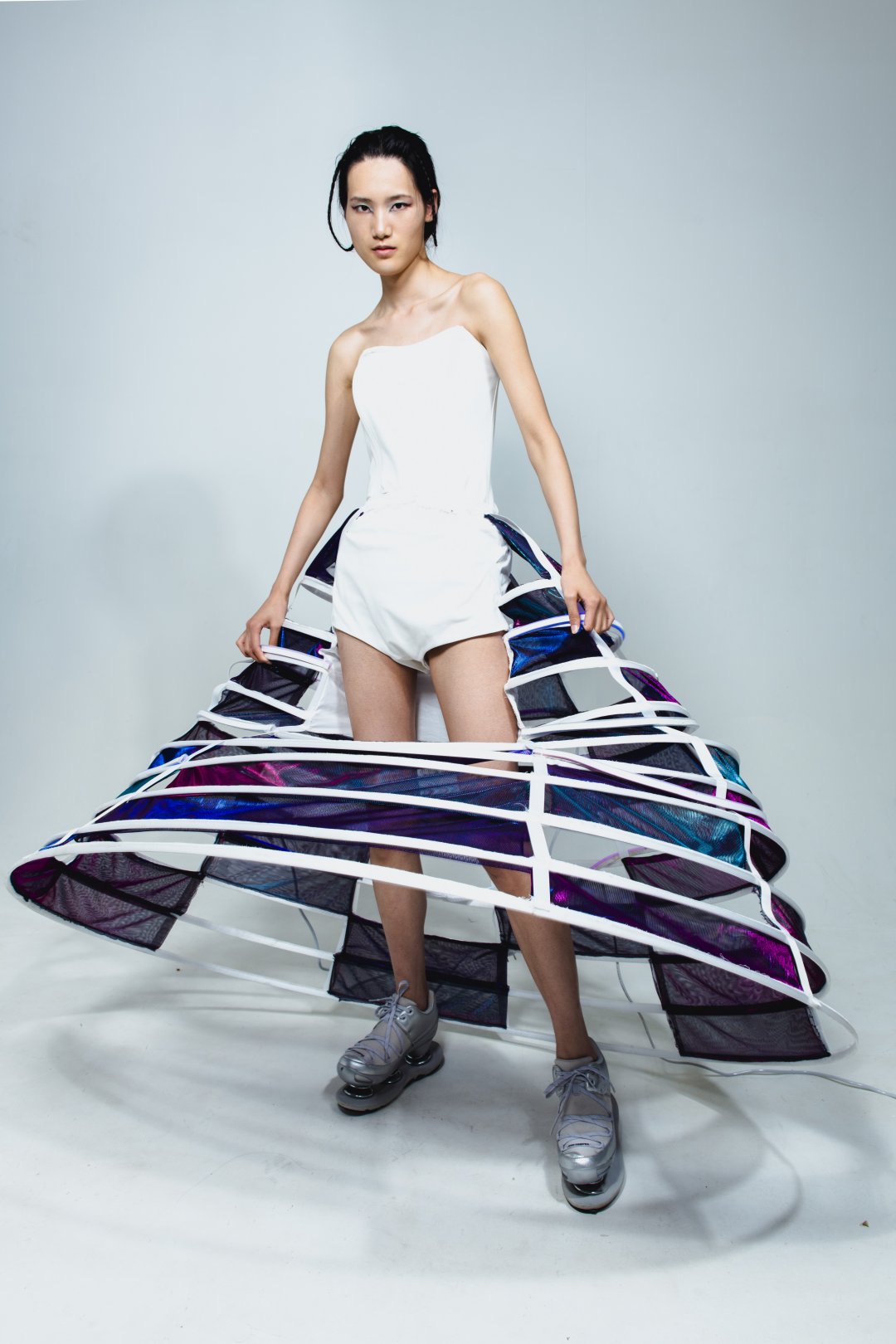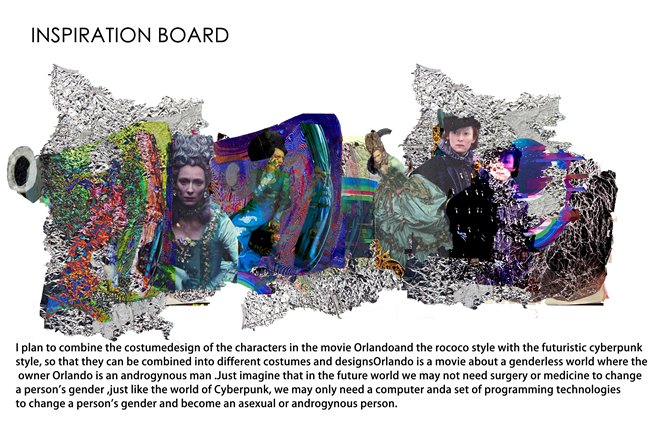 I am a fashion designer and like to decorate every series of works with exaggerated silhouettes and many distinctive fabrics. In the first work Orlando, I want to try the possibility of collision between Rococo style and Cyberpunk elements to show the aesthetic feeling between the two boundaries. The final piece is a ready-made garment with a big skirt. I combined the Rococo style dress of the umbrella skirt with colorful Cyberpunk elements, decorating the skirt body with fresh pastoral patterns and the skirt with bright lights. The collision between them has produced a unique aesthetic feeling.