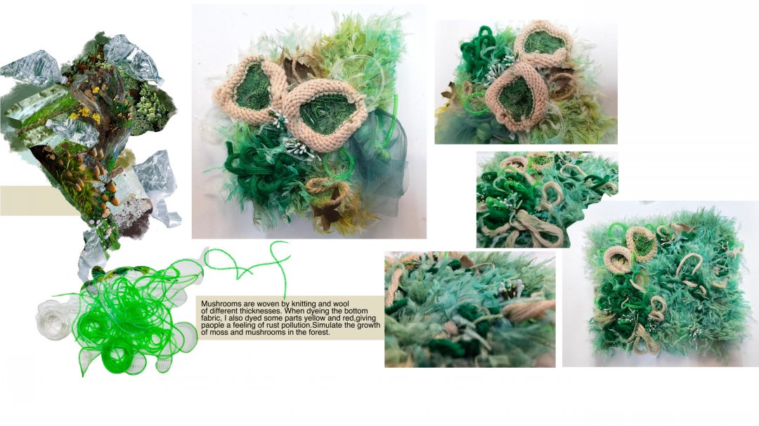 因為家庭的原因,我從小就接觸到了許多面料,因此我對不同的材料的組合產生了濃厚的興趣,環保和可持續的概念也是我在創作設計項目時必不可缺的考慮方面。在作品《滲透》中,我以在森林中的塑料污染現象和《寂靜的春天》這本書為靈感進行面料設計。在這個系列的作品中,我嘗試運用多種非常規材料與傳統面料結合,例如:PVC面料,塑料管,紗,毛線等等,并通過結合多種技術,如針織,滴膠凝固,熱風機融解來體現污染和自然環境互相滲透的主題。最后我設計出了三副手套,以表達所有的污染都是人類親手造成的這一理念,并在自然中拍攝了最后成品的照片和視頻,以表達手和環境無言的對話。