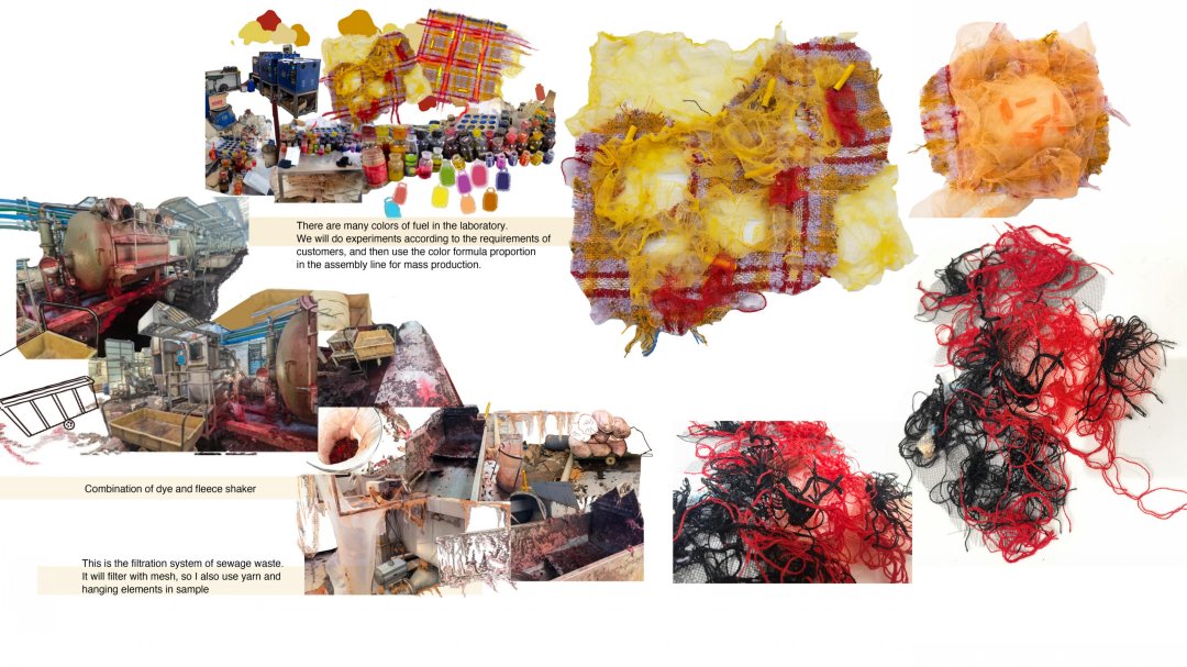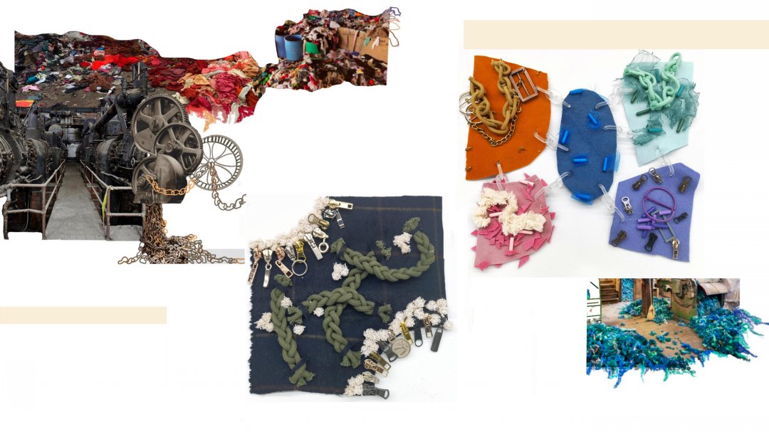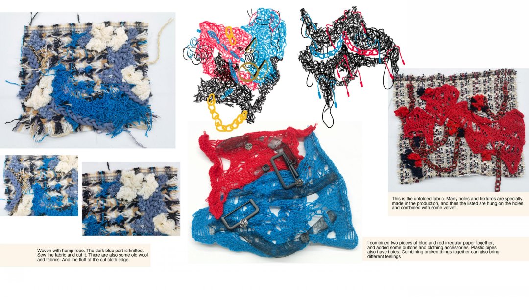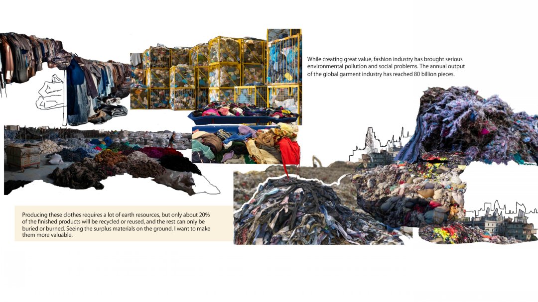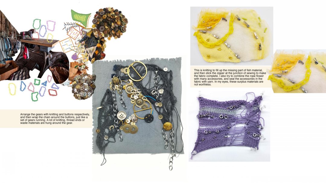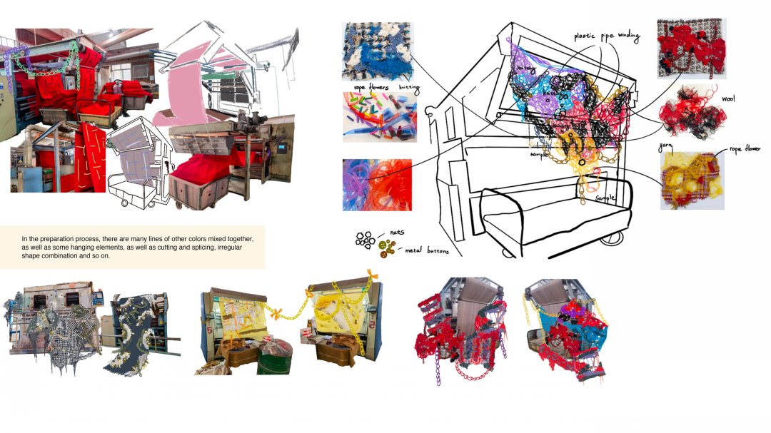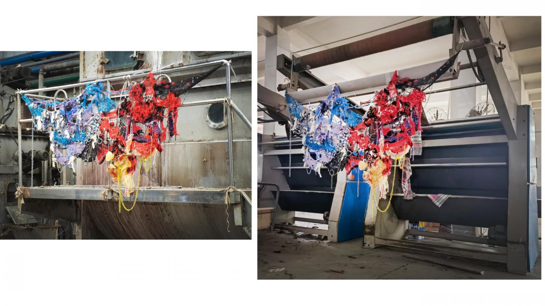 在作品《再生》中,我以在工廠里觀察到的面料浪費現象為靈感,對服裝產業浪費進行了調研,利用工廠收集的廢棄面輔料來進行創作。我從在工廠的一手調研拍攝中提取了面料懸掛、堆積、鎖鏈、機械零件、管道、打包繩、紐扣等元素,結合編織、針織、刺繡等多種工藝進行面料設計,體現出凌亂與規整間的對比、轉換。最后,我把所有面料組合成了一塊大的面料懸掛在了工廠的機器上,我認為這些“不完美”的破損碎片組合起來有種豐富而特別的美感,與灰暗的工廠形成了強烈的對比沖擊。